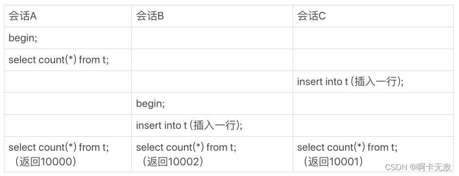 你会看到,在最后一个时刻,三个会话A、B、C会同时查询表t的总行数,但拿到的结果却不同。