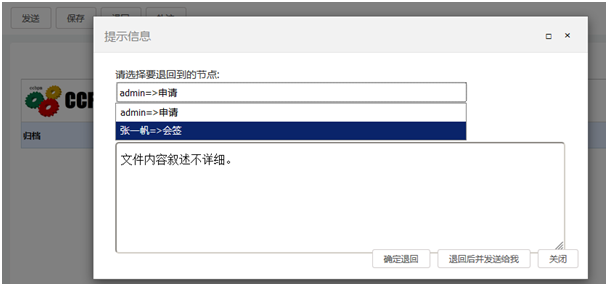 首先选择要退回的节点,然后填写退回原因,最后点击退回方式,完成退回工作。