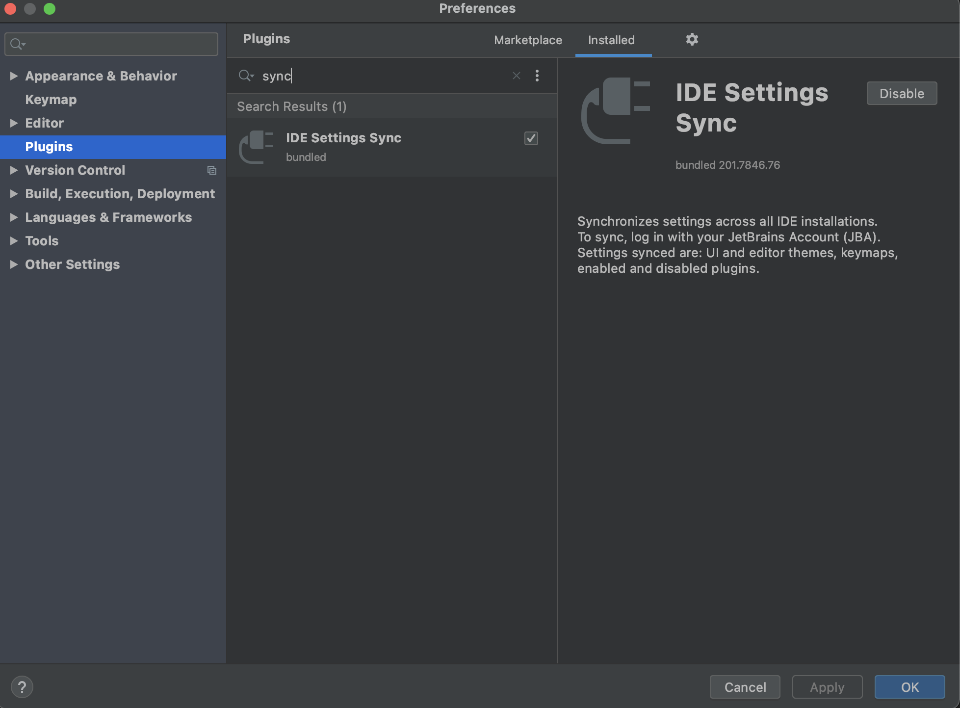 2. File -> Manage IDE Settings -> IDE Settings Sync -> Sync Plugins Silently