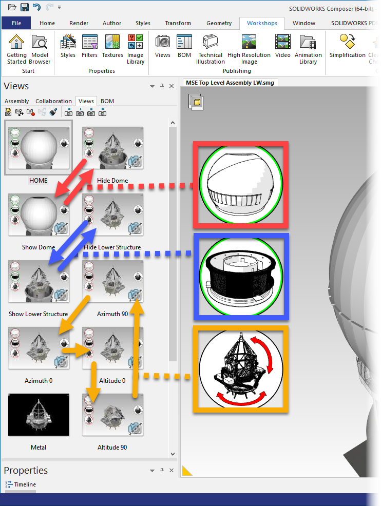 如您所见,每个按钮都会使用户进入自定义视图的重复循环。请注意,使用SOLIDWORKS Composer 2019及更新版本,您可以通过视图缩略图右下角的摄像头图标识别自定义视图。现在我有了按钮,如何创建这些自定义视图并将它们与按钮相关联?让我们继续圆顶的例子。