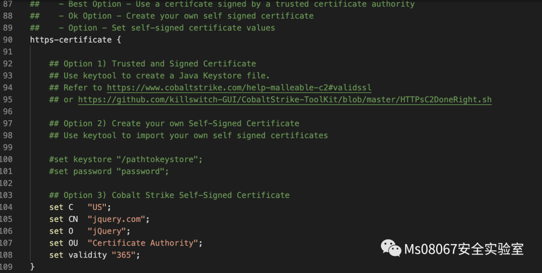 此设置控制用于HTTPS通信的SSL证书。如果可能的话,请为你正在使用的域使用真实的,正确发布的SSL证书。LetsEncrypt可以发布所有主要操作系统和浏览器都信任的免费SSL证书,并且会让防御者更难以检查Beacon流量。