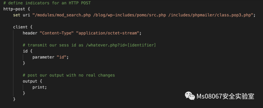 set useragent "Mozilla/5.0 (Windows; U; MSIE 7.0; Windows NT 5.2) Java/1.5.0_08"; #这个一般结合实战环境去配置,从目标机构中捕获一个真实的user-agent值并且插入到真实的流量中。