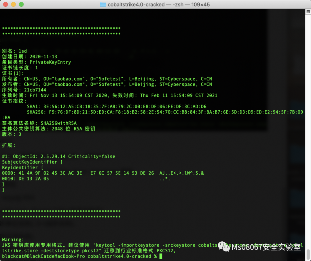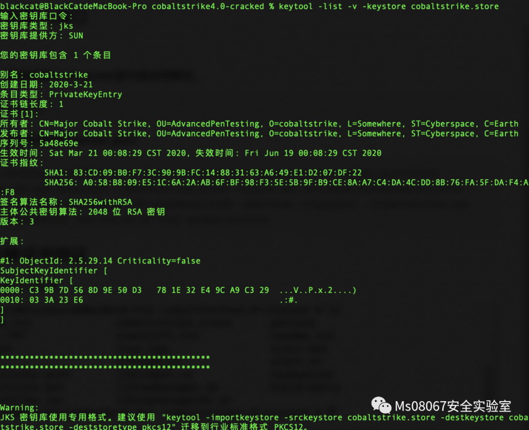 查看keytool -list -v -keystore cobaltstrike.store 证书情况,输入默认密码123456回车,可以看到所有者、发布者中Cobalt Strike相关字样。