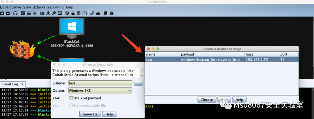 然后连接后,点击 Cobalt Strike -- Listeners创建一个监听模块。然后通过这个监听模块创建一个后门文件 ,然后去上线一台机器。