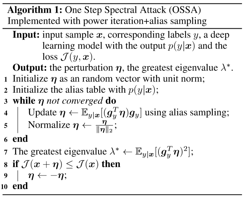 在大数据集下,如果直接特征分解矩阵 G x G_{x} Gx的最大的特征向量,那么计算复杂度会非常大。为了避免计算开销可以通过计算 G x η \boldsymbol{G}_{\boldsymbol{x}} \boldsymbol{\eta} Gxη来代替。则会有如下形式: G x η = E y ∣ x [ ( g y T η ) g y ] (19) \tag{19} \boldsymbol{G}_{\boldsymbol{x}} \boldsymbol{\eta}=\mathbb{E}_{y | \boldsymbol{x}}\left[\left(\boldsymbol{g}_{y}^{T} \boldsymbol{\eta}\right) \boldsymbol{g}_{y}\right] Gxη=Ey∣x[(gyTη)gy](19)其中, g y = ∇ x J ( y , x ) \boldsymbol{g}_{y}=\nabla_{\boldsymbol{x}} \mathcal{J}(y, \boldsymbol{x}) gy=∇xJ(y,x)是类 y y y的损失函数关于样本 x x x的梯度。此方法是通过计算内积来代替处理矩阵的特征分解,其中,最大的特征值为 E y ∣ x [ ( g y T η ) 2 ] \mathbb{E}_{y | \boldsymbol{x}}\left[\left(\boldsymbol{g}_{y}^{T} \boldsymbol{\eta}\right)^{2}\right] Ey∣x[(gyTη)2]。用幂迭代的方法来加速矩阵 G x G_{x} Gx的特征分解,具体的迭代形式如下所示: