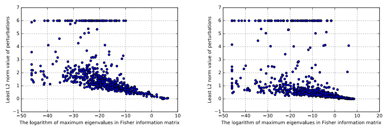 Fisher信息度量可以用于测量模型局部鲁棒性,因此本实验来验证模型鲁棒性与Fisher信息矩阵的最大特征值之间的关系。如下图所示,显示了MNIST和CIFAR-10的验证集中的800个随机选择的样本的分散性,。横轴是特征值的对数,而纵轴是最小的对抗扰动大小。结果表明,特征值与模型易损性之间存在明显的相关性:最小扰动随特征值的指数增长线性减小。合理的解释是,特征值反映了Fisher信息量度下的扰动大小。根据最优性分析,较大的特征值会导致输出似然性的等距变化,从而更有可能以较小的扰动大小欺骗模型。