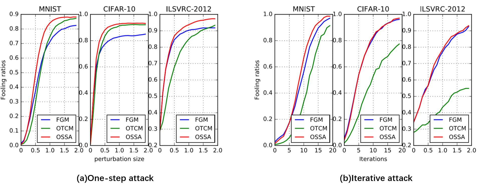 本实验比较OSSA,FGM,OTCM这三种攻击算法的攻击模型的能力。如下图(a)所示,在单步攻击下,模型误分类率随着扰动大小的增加而增大,并且可知OSSA攻击算法在给定一个扰动下,它会以更快的速度达到一个高的攻击准确率。如下图(b)所示,在多步迭代攻击中,模型误分类率随着攻击的迭代次数的的增加而增大,并且可知OSSA算法在给定一个扰动下,能更快的收敛到一个较高的攻击准确率。