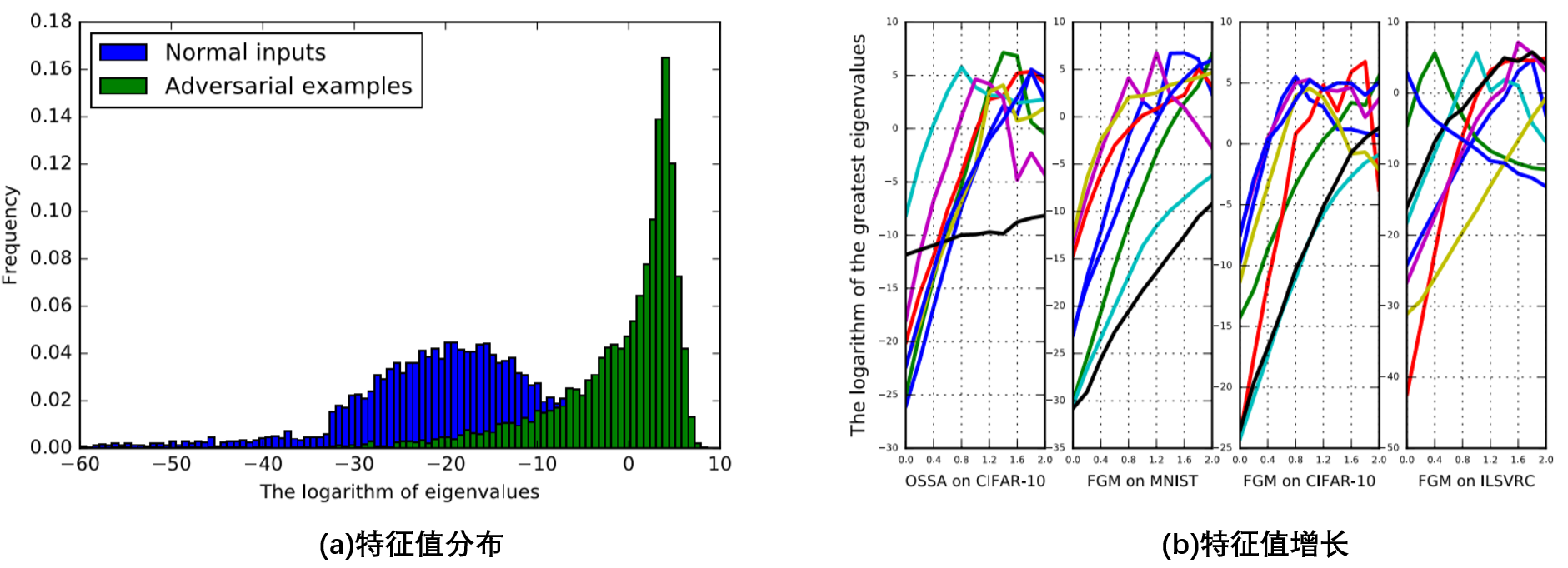 本实验探究Fisher信息矩阵中的特征值是如何检测对抗攻击。如下图所示,图(a)显示了特征值分布的直方图,FGM为MNIST的样本生成对抗样本,并在FIM中评估其最大特征值。直方图显示正常样本和对抗样本的特征值分布大小不同。后者的特征值在较大的域中密集分布,而前者的分布近似为具有较小均值的高斯分布,但是通过添加更多特征值作为特征,可以大大增强对抗示例的可分离性。图(b)为特征值随扰动大小的增加而大,这表明与正常样本相比,对抗样本在Fisher信息矩阵中具有更高的特征值。