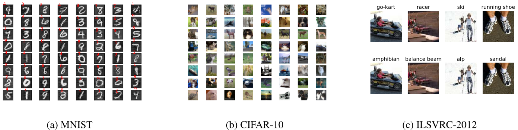 OSSA算法在MNIST, CIFAR-10,ILSVRC-2012数据集上生成的对抗样本的可视化如下图所示: