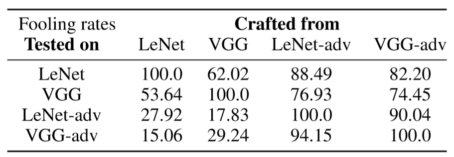 本实验是探究由OSSA算法生成对抗样本在不同模型(尤其是通过对抗训练正则化的模型)中迁移性的情况,该实验是在MNIST上进行的,该网络具有四个不同的网络:LeNet,VGG及其对抗训练变体,在这里分别称为LeNet-adv和VGG-adv。实验结果如下表所示,对抗样本跨模型的迁移率在不同模型之间是不对称的,未经对抗训练的模型迁移到经过对抗训练的模型平均会产生22.51%的误分类率,而反之平均产生80.52%的误分类率。