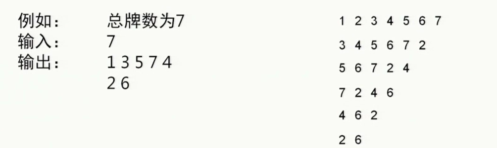 ►桌上有一叠牌,从第一张牌开始从上往下依次编号1~n。当至少还剩两张牌时进行如下操作:把第一张牌扔掉,然后把新的第一张牌放到整叠牌的最后。请输入总牌数n,输出每次扔掉的牌,以及最后剩下的两张牌。
