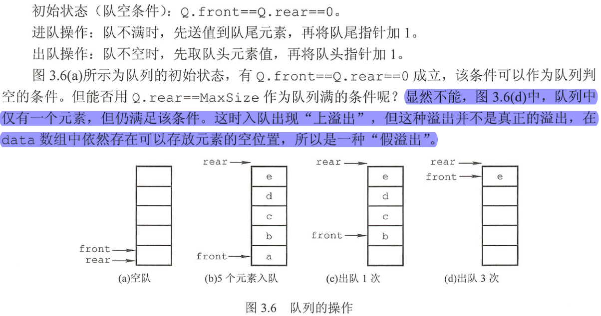 ►队列的顺序实现是指分配一块连续的存储单元存放队列中的元素,并附设两个指针:队头指针front指向队头元素,队尾指针rear指向队尾元素的下一个位置(不同教材对front 和rear的定义可能不同,例如,可以让rear指向队尾元素、front指向队头元素。对于不同的定义,出队入队的操作是不同的)。
