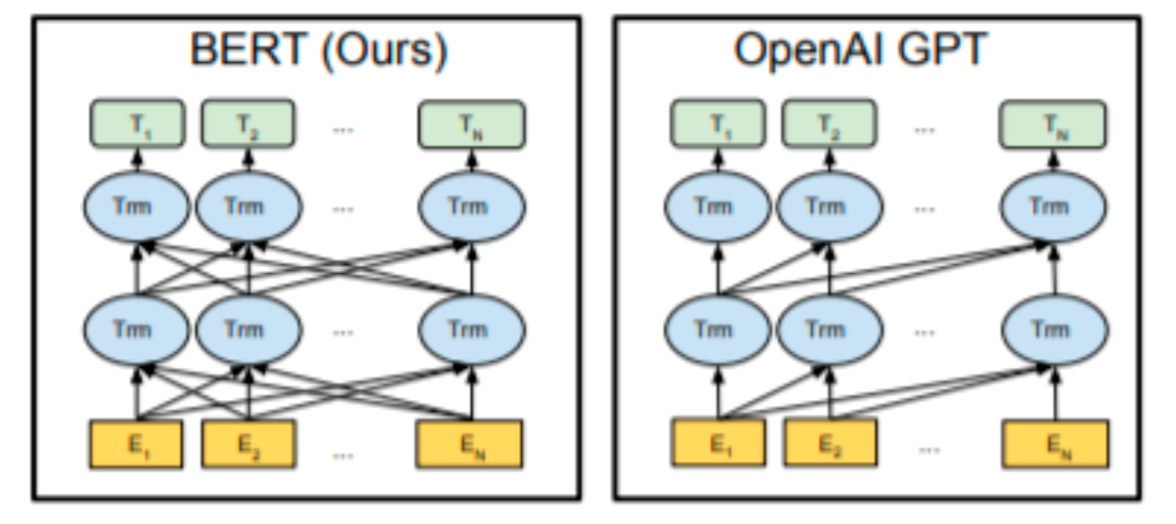 上述缺陷促使研究人员提出了一种深度神经网络,该网络能够以无监督的方式进行训练,同时能够捕获文本中包含单词的上下文含义。一些早期的尝试包括各种预训练模型,例如基于LSTM [13]构建的ELMo [11]和ULMFiT [12],但是,最成功的是BERT [1]和Open-GPT [2],与ELMo和ULMFiT不同,BERT和Open-GPT构建在Transformer[14]结构之上,不同之处在于BERT使用双向自注意力,而Open-GPT仅使用单向注意力,如图1所示。Transformer的结构与LSTM有两个重要不同,首先,它允许使用残余连接和批处理归一化来连接多层网络,从而允许自由梯度流动。其次,Transformer的核心计算单元是矩阵乘法,这使研究人员可以充分利用TPU的全部计算潜力[15]。经过大型语料库的训练后,BERT和Open-GPT都能够更新许多重要自然语言任务的基准,例如SQuAD [4],CoQA [5],命名为实体识别[6],Glue [7],机器翻译[8]。