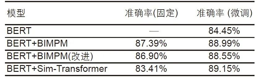 本次实验将仅对BERT进行fine-tune的方法FT-NTM为baseline,对比了在BERT之后接BIMPM网络的效果。同时以方法NFT-TM为baseline,对比了两种改进BIMPM之后模型结构的效果(移除BIMPM中的第一层Bi-LSTM模型和将BIMPM的matching层与transformer相结合的模型)。注意,在模型训练时有个重要的技巧,考虑到预训练模型本身的效果和其与顶层模型的融合问题,在训练模型时,需要分两步进行:先固定预训练模型的参数,仅训练其上层特定任务网络,第二步再将整个网络联合训练。实验结果如表4中所示,可以看出,由实验结果可得,Bert+Sim-Transformer结合fine-tune Bert的FT-TM算法效果相较仅对BERT进行fine-tune的方法FT-NTM,准确率提升了近5个百分点,达到了目前的State of the Art。