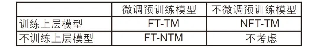 在存在预训练语言模型的情况下,那么如何最好地利用预训练模型获得更好的效果呢?在这方面,Peters等[3]研究了如何使用预训练模型最佳地适应目标任务,并提出了两种不同的适应算法:特征提取算法和直接微调预训练模型算法,这对应于表1中的算法NFT-TM和FT-NTM,Peters等进行了五个实验,包括:(1)命名实体识别[6];(2)情绪分析[16];(3)自然语言推论[17];(4)复述检测[18];(5)语义文本相似度[19]。通过执行所有这些任务,Peters等得出的结论是,算法FT-NTM比NFT-TM的效果更好。