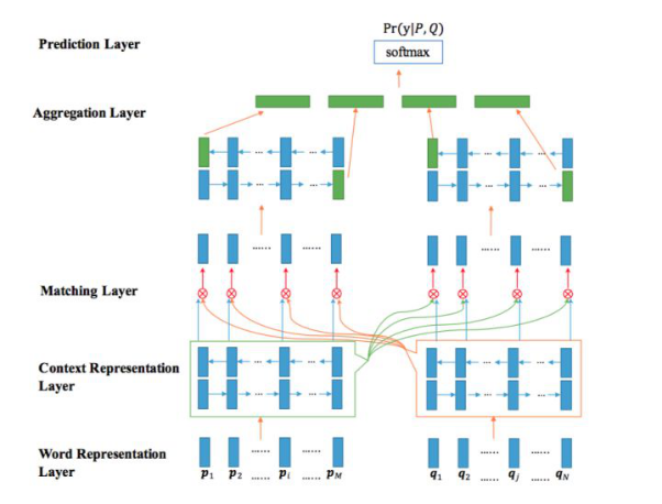 首先,我们去掉了原始BIMPM模型中接在字向量层的Bi-LSTM模型,之所以这样做,其原因在于LSTM并没有设计机制保证梯度向深度模型的后向传导;