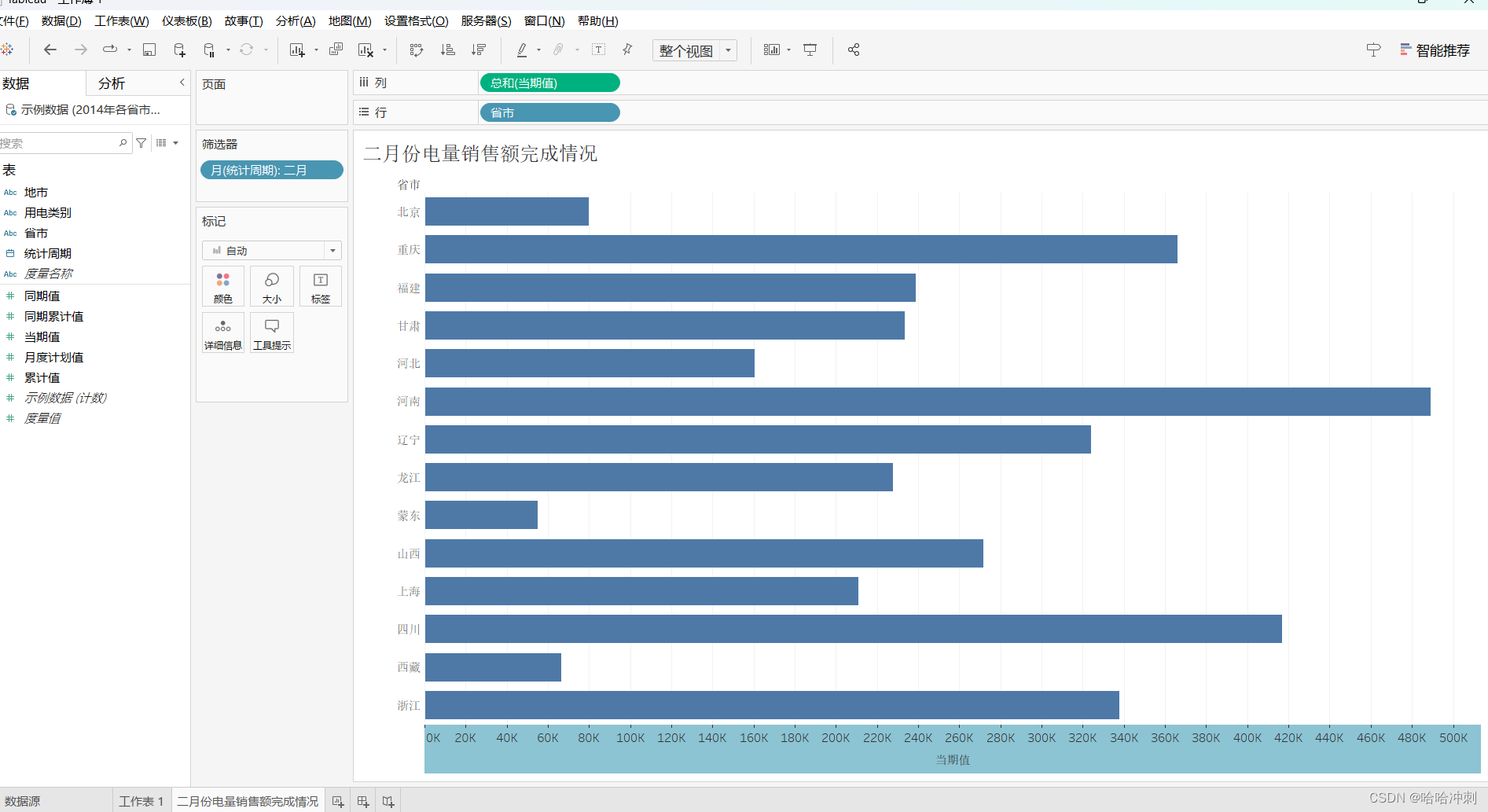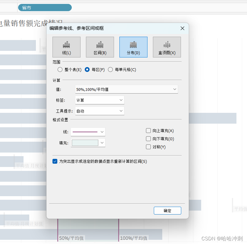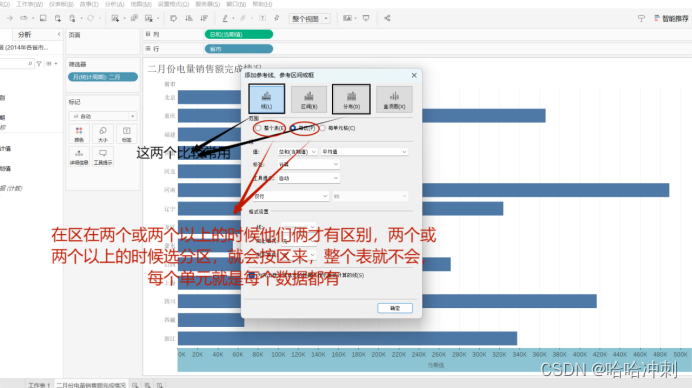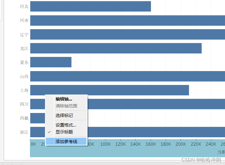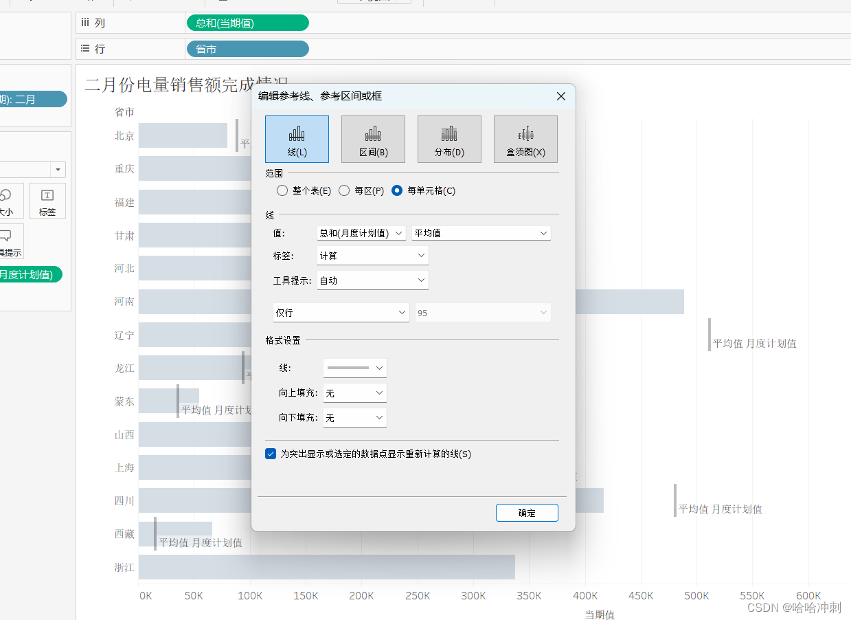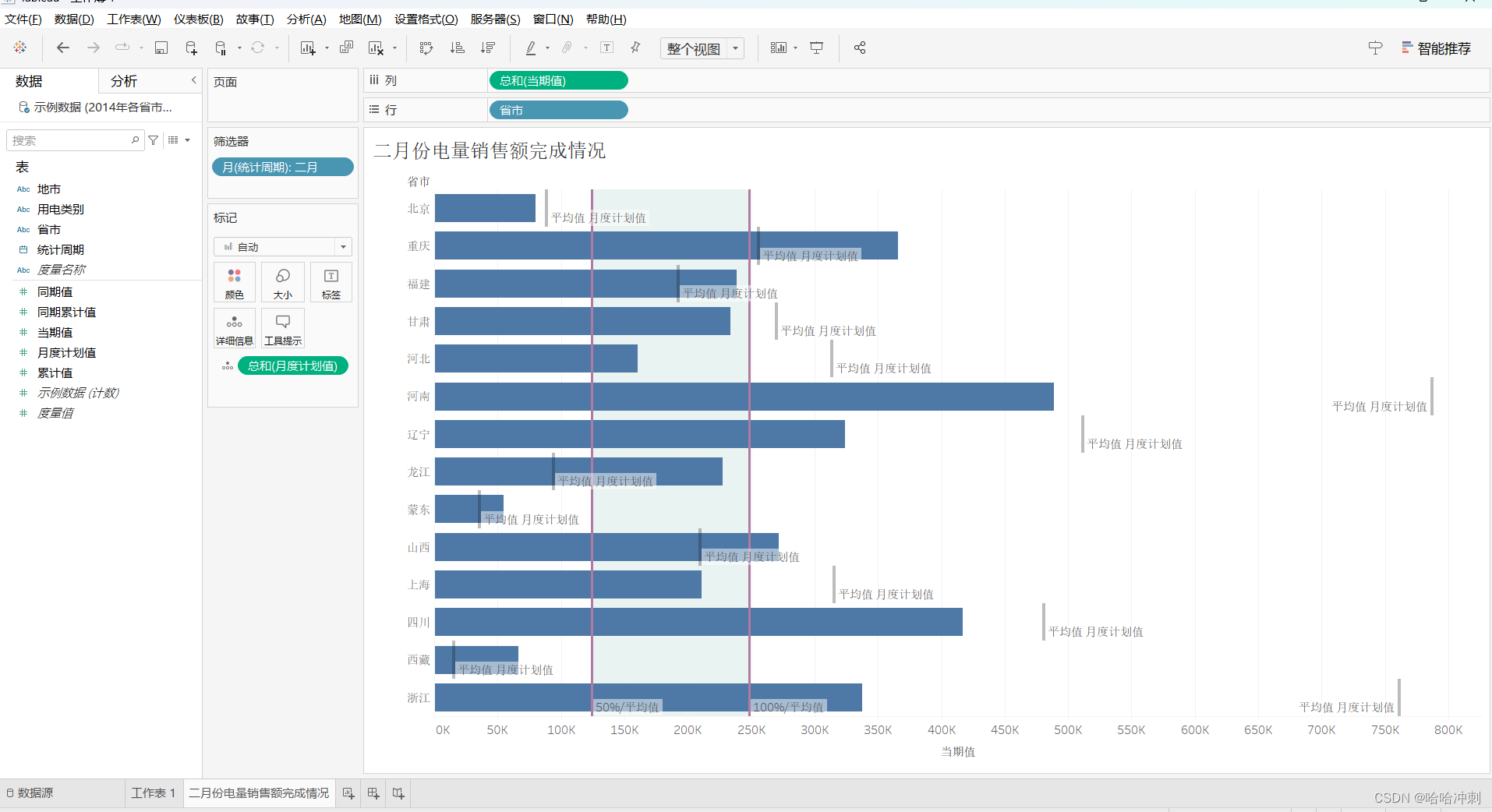 标靶图是一种特殊形式的条形图,就是在条形图的基础上添加参考线和参考区间,帮助使用者直观了解两个度量之间的关系,常用来比较目标值和实际值。例如:销售额完成情况、实际花费和预算的比较。