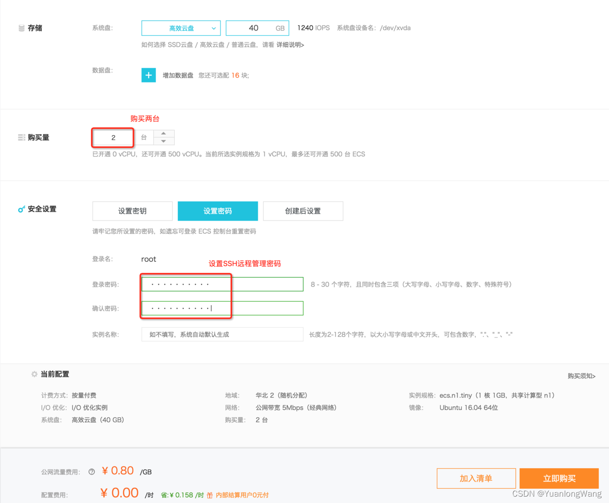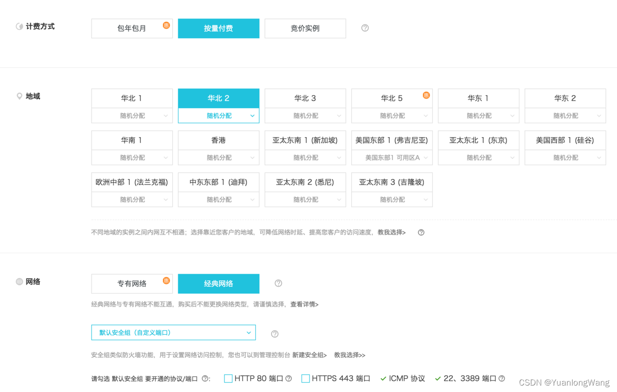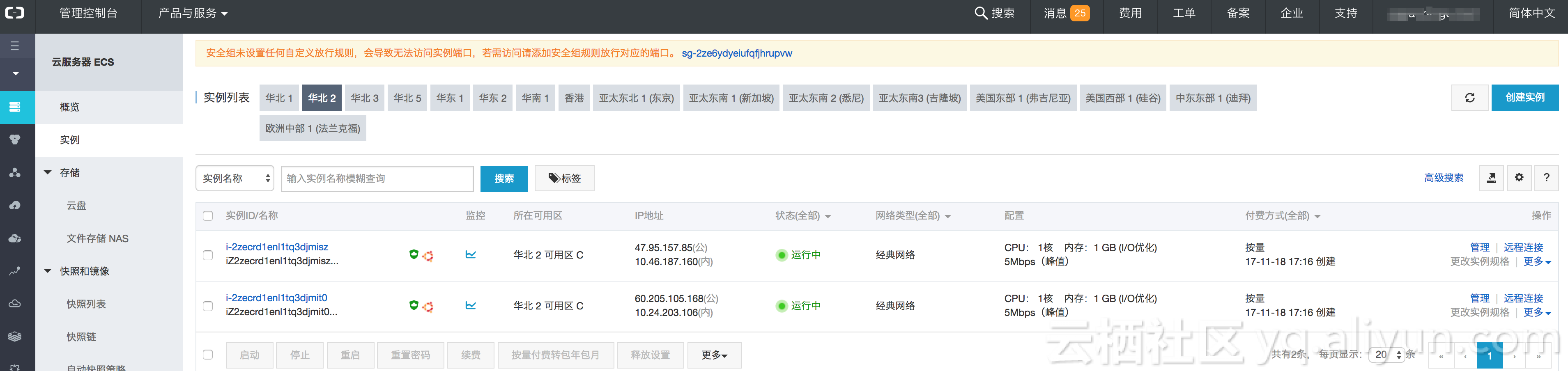 首先我们购买两台云服务器,这里我们选择华北2(北京)区域,购买两台按量付费的云服务器,云服务器的处理能力不重要,选择最低配够演示需求即可,购买参数如下: