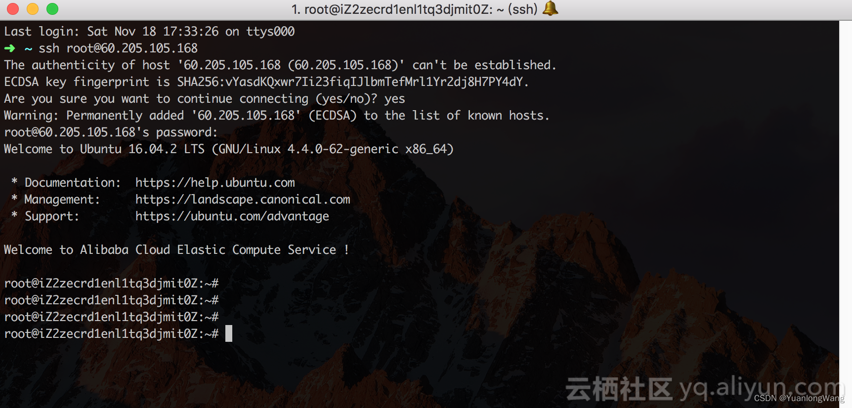 1、通过ssh登录到ecs云服务器,注意这里需要使用云服务器的公网ip,在控制台中输入命令行:ssh root@xxx.xxx.xxx.xxx,回车后并输入在购买时设置的SSH远程管理密码即可登录。第一次登录时会有个提示,选择yes即可