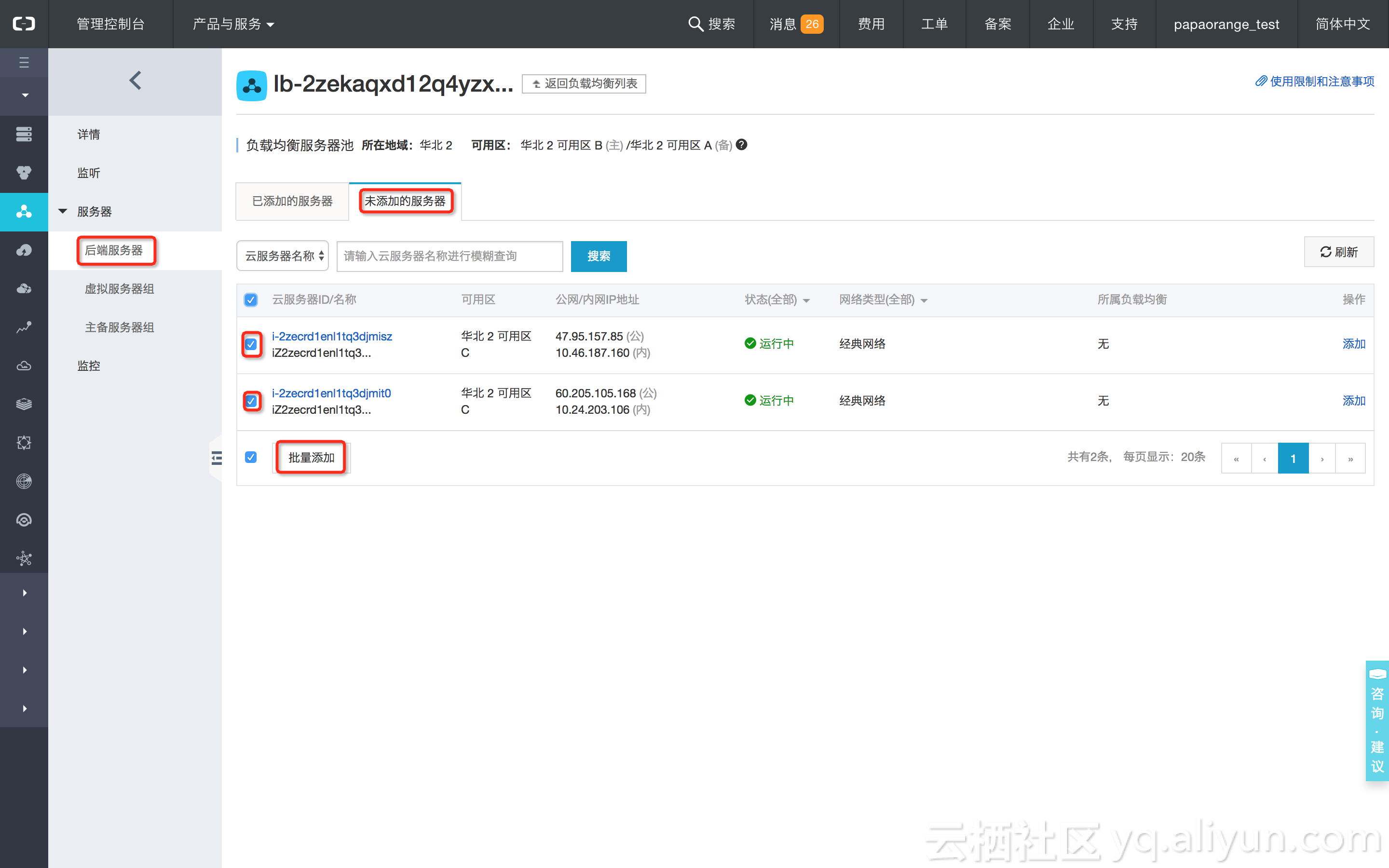 创建好监听后,我们点击后端服务器菜单项,切换未添加的服务器tab页,勾选列表中的2台云服务器(就是之前在华北2区域购买的2台云服务器),然后点批量添加