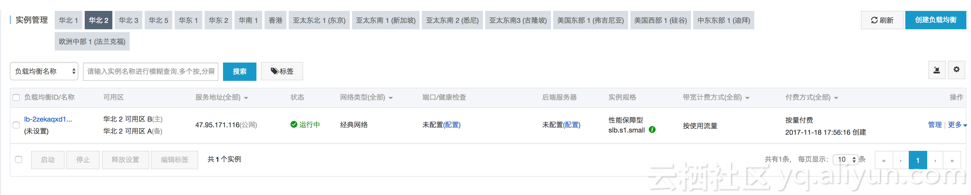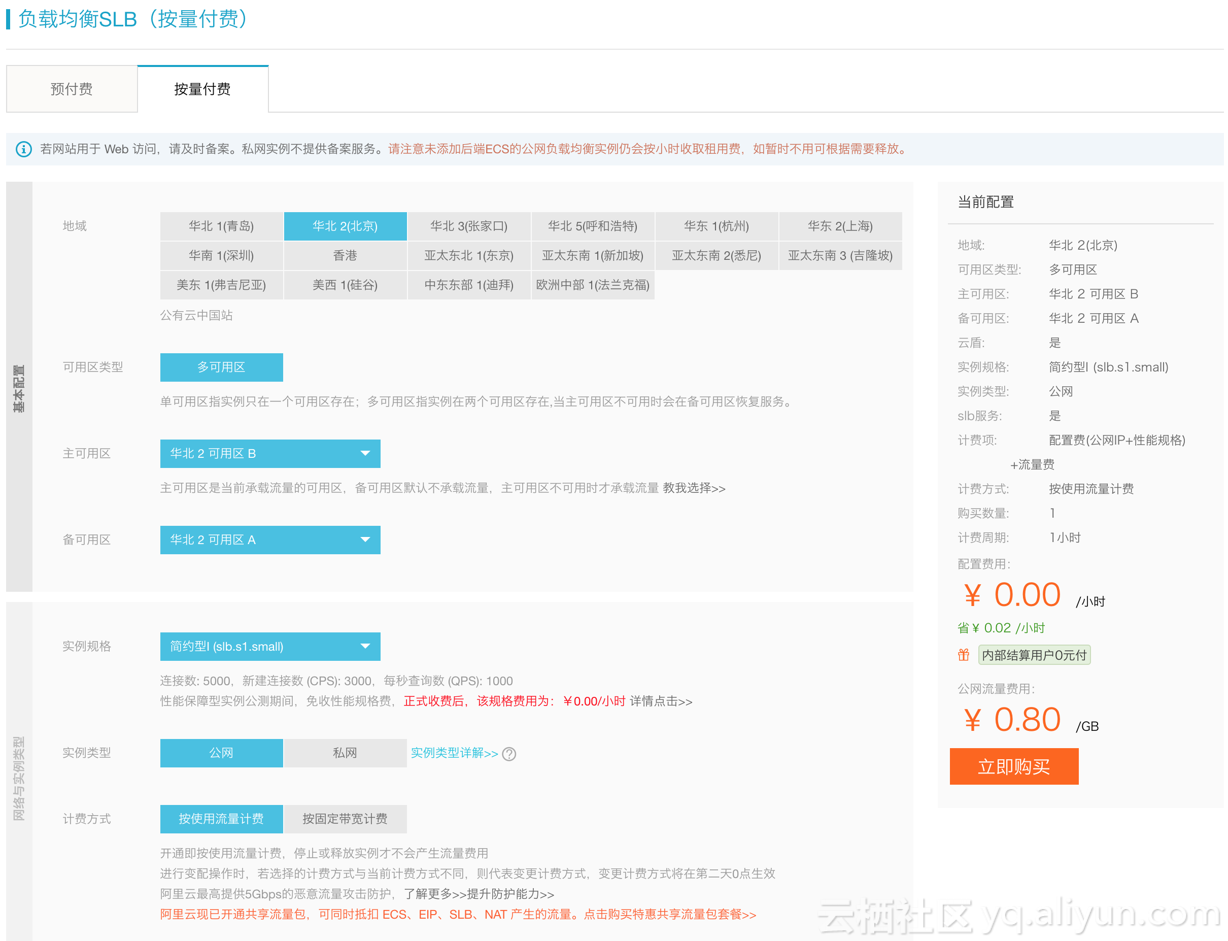 至此,云服务器ECS就准备好了,下面我们来购买一台负载均衡,同样我们要在华北2(北京)区域购买,负载均衡和后端服务器ECS必须保持在同一可用区。