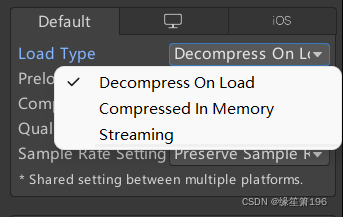 Decompress On Load:以不压缩的形式存在内存,用的时候方便,但是占用内存高