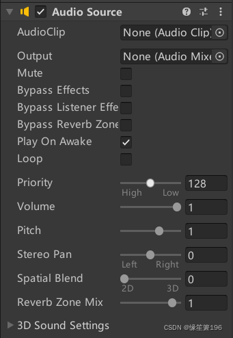 Preload Audio Data : 预加载音频资源,如果勾选那么该物体进入场景就会马上加载;如果不勾选,第一次使用音频时才会加载进来
