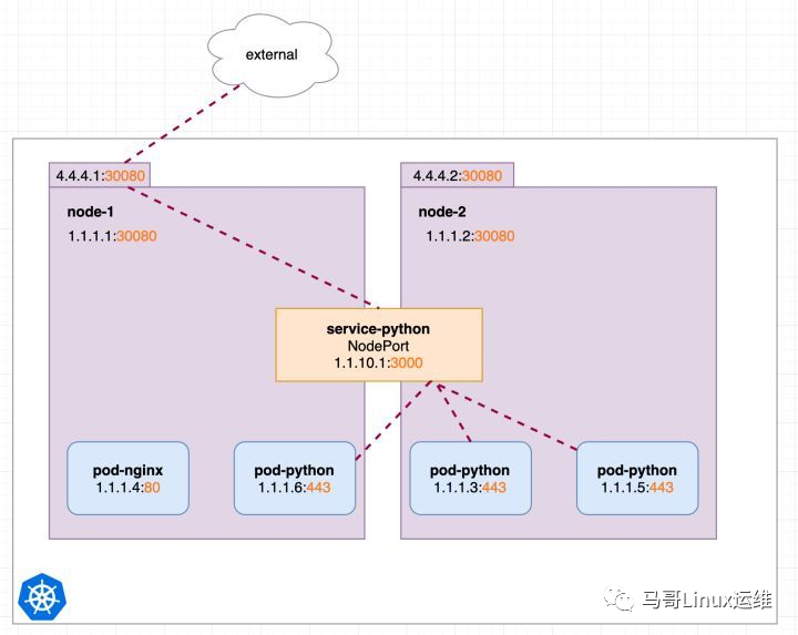 apiVersion: v1kind: Servicemetadata:name: service-pythonspec:ports:- port: 3000protocol: TCPtargetPort: 443nodePort: 30080selector:run: pod-pythontype: NodePort