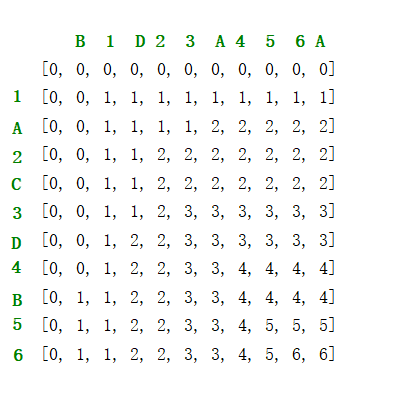 public String LCS (String s1, String s2) {int[][] dp = new int[s1.length() + 1][s2.length() + 1];int[][] direction = new int[s1.length() + 1][s2.length() + 1];String res = "";for (int i = 0; i < dp.length; i++) {for (int j = 0; j < dp[i].length; j++) {if (i == 0 || j == 0) {dp[i][j] = 0;direction[i][j] = 0;} else {if (s1.charAt(i - 1) == s2.charAt(j - 1)) {dp[i][j] = dp[i - 1][j - 1] + 1;direction[i][j] = 1;} else {if (dp[i - 1][j] > dp[i][j - 1]) {dp[i][j] = dp[i - 1][j];direction[i][j] = 3;} else {dp[i][j] = dp[i][j - 1];direction[i][j] = 2;}}}}}int i = dp.length - 1;int j = direction[0].length - 1;while(i>0 && j>0) {if (direction[i][j] == 1) {res = s1.charAt(i - 1) + res;i--;j--;} else if (direction[i][j] == 2) {j--;} else if (direction[i][j] == 3) {i--;} else {i--;j--;}if (i <= 0) break;}if (res.equals("")) {return "-1";}return res;}BM66 最长公共子串