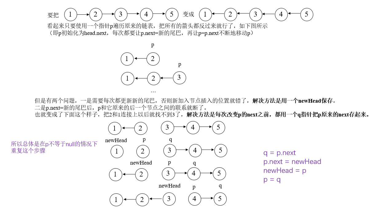 public ListNode ReverseList(ListNode head) {if(head==null) return null;ListNode p = head.next;ListNode newHead = head;head.next = null;while(p!=null){ListNode q = p.next;p.next = newHead;newHead = p;p = q;} return newHead; }