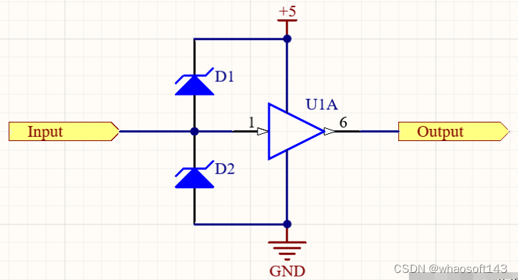 典型的电压钳位二极管电路如下所示。该电压钳位电路主要是限制缓冲器输入端的电压累积。