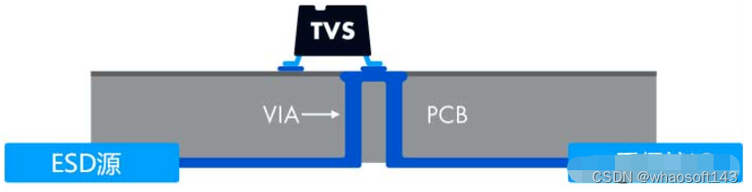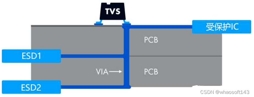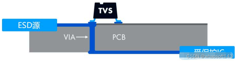 理想情况下,ESD 源和 TVS 应该放在同一层,如下图所示。这样,ESD 电流先流过 TVS 保护引脚,然后再通过 VIA 流向受保护电路。在这种情况下,TVS 直接位于从 ESD 源到受保护电路的路径上。