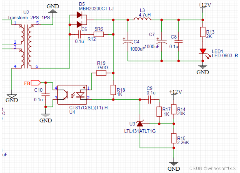 上图中的431不是用于稳压,而是用作一个电压门限开关,它与R14,R15一起检测+12V电压的变化,当+12V电压升高时,431的K极和A极短接,然后将光耦发光二极管的阴极接地,光耦导通,电源芯片(TMG0165)的第一管脚(FB)被拉低,芯片便调整输出占空比,使+12V电压降低。当+12V降低时,光耦不导通,电源芯片 FB 端为高电平,调整输出占空比,使+12V升高。