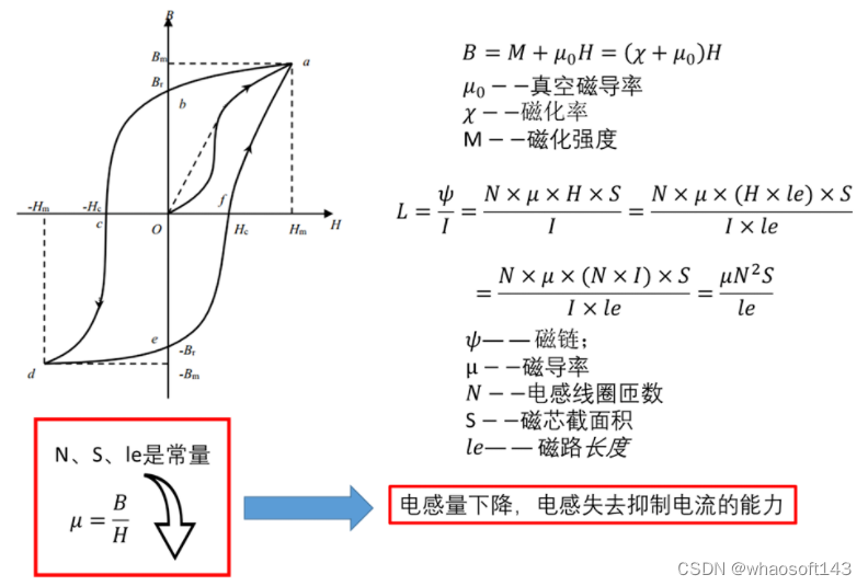 当电感饱和后,µ会大幅度减小,最终导致电感量大幅降低,失去抑制电流的能力。