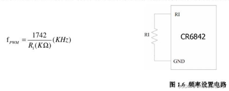 CR6842 允许设计者依据系统的使用环境自行调制系统的工作频率,CR6842的典型工作频率为65KHZ,其应用电路如下: