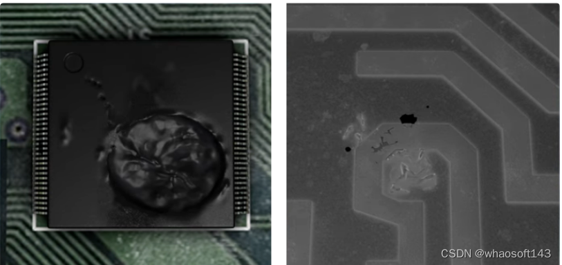 集成电路封装(左)和管芯(右)上的极端 ESD 损坏