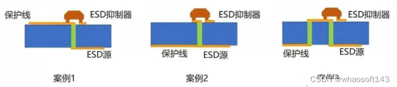 最差的是源线和保护西安在同一侧,而ESD抑制器在另一侧,必须要避免这种情况(下图中的案例二)。在这种情况下,最好使用另一个过孔在ESD抑制器之后连接受保护线路,而不是直接将ESD源直接连接到受保护线路(下图中案例3)。