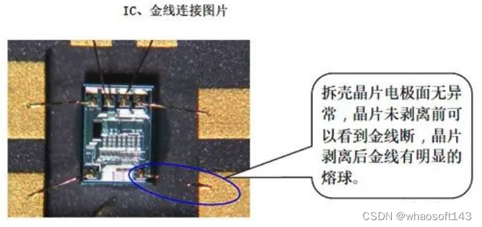 针对该晶振开盖检验,发现晶片电极面、IC无异常,金线表现为明显的熔断结球现象,从而造成电路断路。