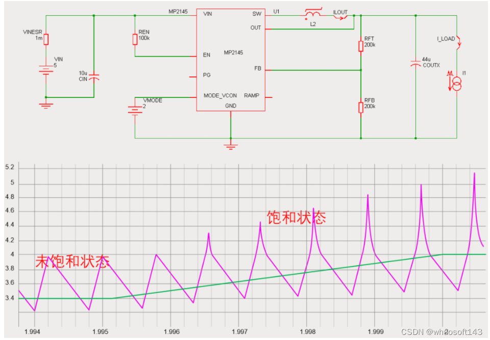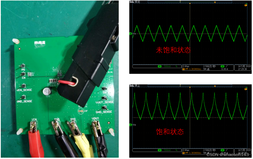 下面是在MP2145 Demo板上实测波形,可以看到饱和后有明显的畸变,与仿真结果一致。