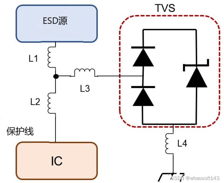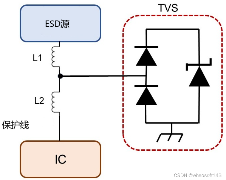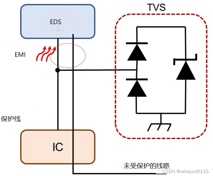 在这种情况下,尽管 TVS 在其路径上,但一部分 ESD 电流将流向受保护的 IC。