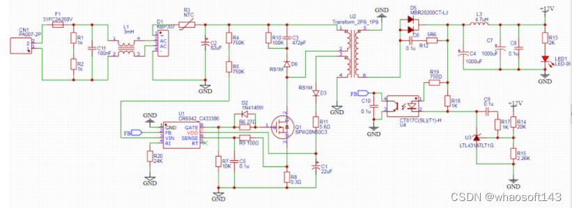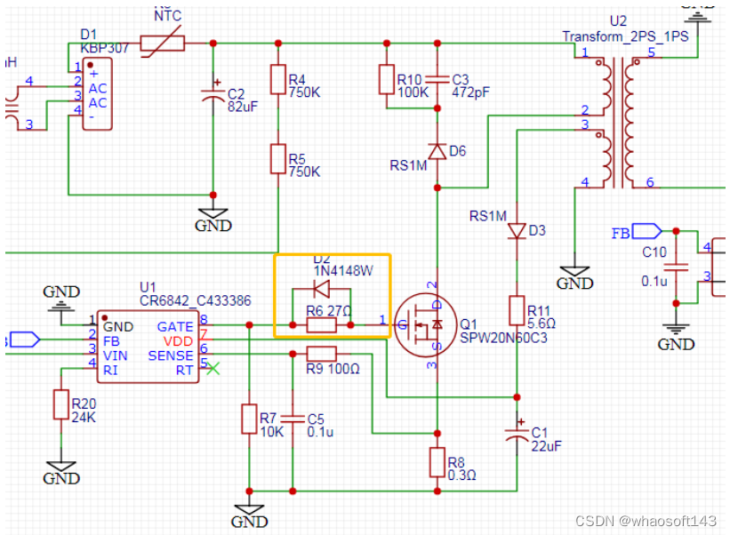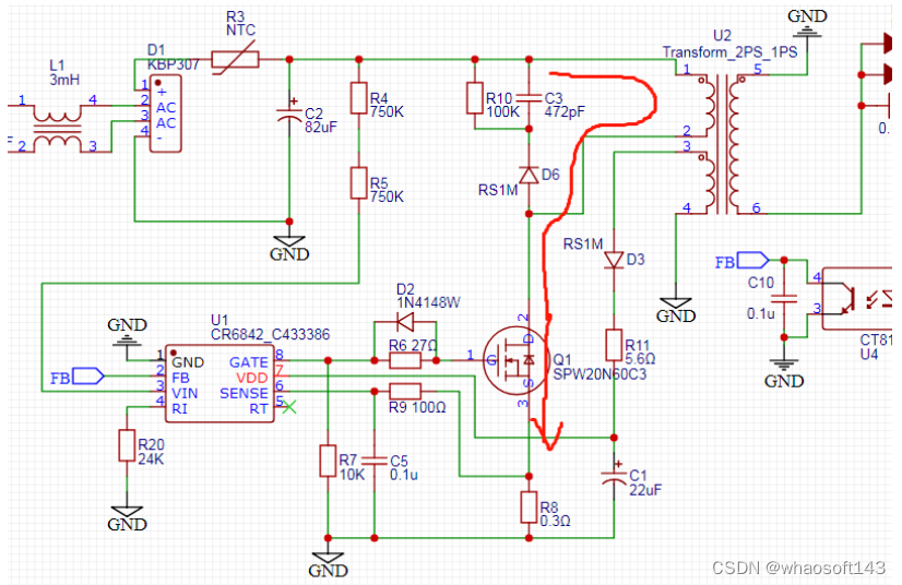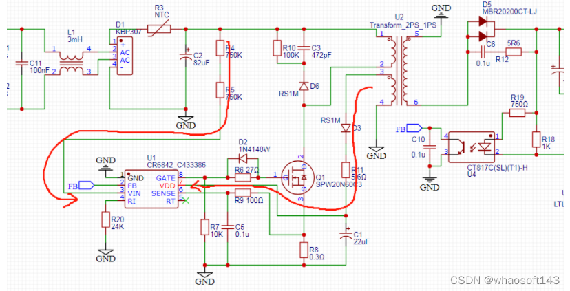 右侧,当电源上电开机时,通过启动电阻R11给 VDD端的电容C1 充电,直到VDD端口电压达到芯片的启动电压 Vth(ON) (典型值 16.5V)时,芯片才被激活并且驱动整个电源系统正常工作。
