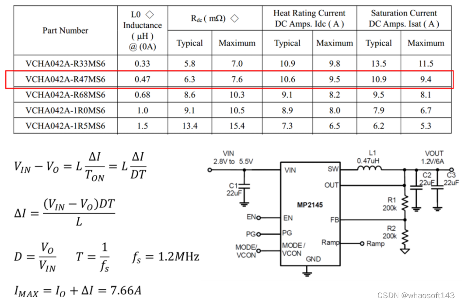 以Buck芯片MP2145为例,可以按照如下公式计算,将计算结果与电感规格值相比较就能判断电感是否会饱和。