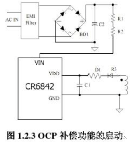 (2) 具有OCP补偿功能的启动方式:使用3脚VIN作为启动引脚时芯片具有OCP补偿功能,但仅支持从整流滤波后启动的方式,如下所示: