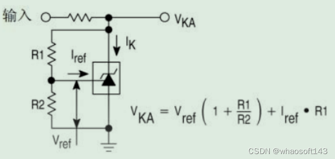 当输入电压变化时,431会将变化的电压通过电流的作用转化到输入端的电阻上,其过程为:当输入端电压升高时,431的 K 极与 A 极之间的三极管 CE极电流增大,即 Ik电流变大(而 R1 和 R2 上的电流不变)输入端的电阻压降升高,从而保证 VKa 不变。当输入端电压降低时,431 的 K极和 A极 之间的三极管 CE极电流减少,即 Ik电流减少(而 R1 和 R2 上的电流不变),输入端的电阻压降减少,从而保证 VKa 不变。