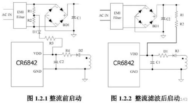 (1) 传统启动方式:使用VDD作启动引脚时,芯片支持整流前启动与整流滤波后启动,启动电路如下: