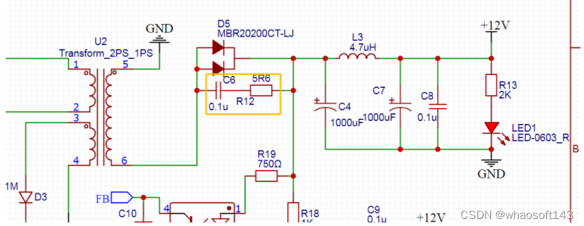 C6 与 R12 串联组成吸收回路与二极管并联,其作用是抑制方向峰值电压(削弱尖峰)对二极管的造成耐压不足引起损坏。