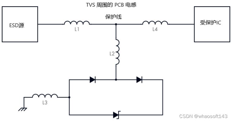 所有 PCB 元件和走线都有寄生电感。在典型的保护方案中,有四个:ESD 源 和 TVS 阵列之间的电感(L1 和 L2)、TVS 和地之间的电感(L3)以及 TVS 和受保护集成电路之间的电感.。