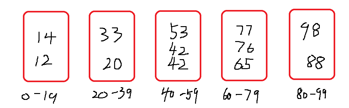 我们举个例子来帮助理解,现在有一个数组:20,33,42,12,65,42,98,76,14,88,53,77。运用桶排序,假设我们划分5个桶,分别装0-19,20-39,40-59,60-79,80-99的数,再将每个桶中的数进行排序,可以运用快排,最后再将一个一个桶里的数依次取出,即完成排序。