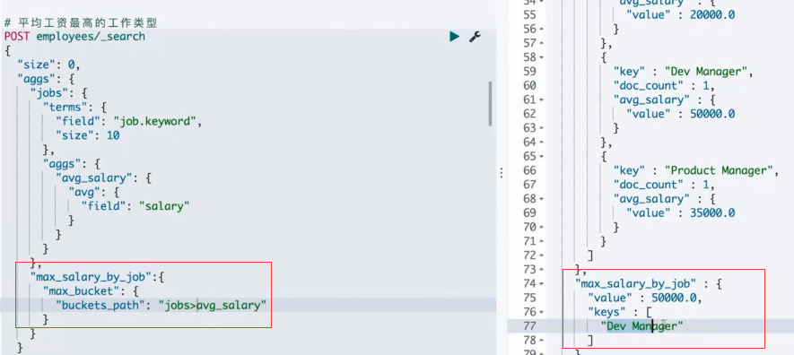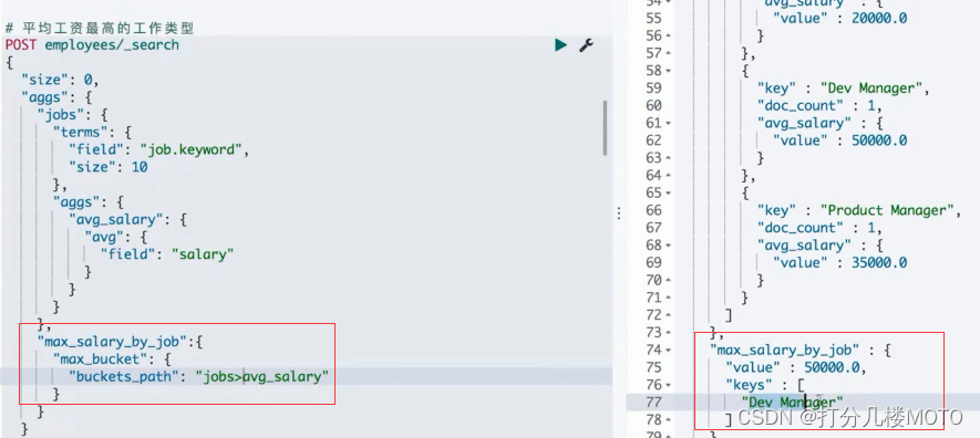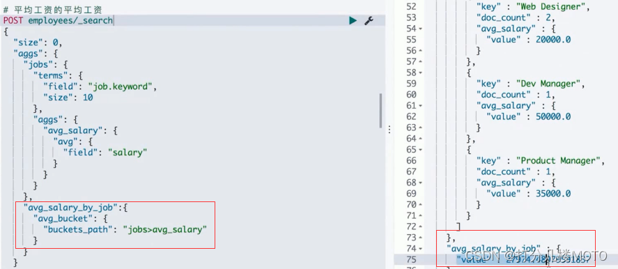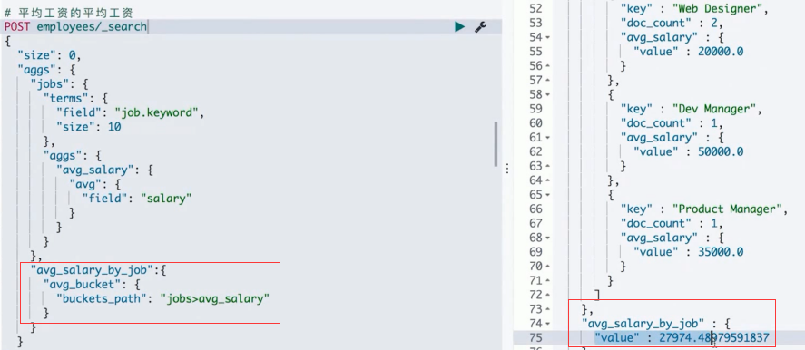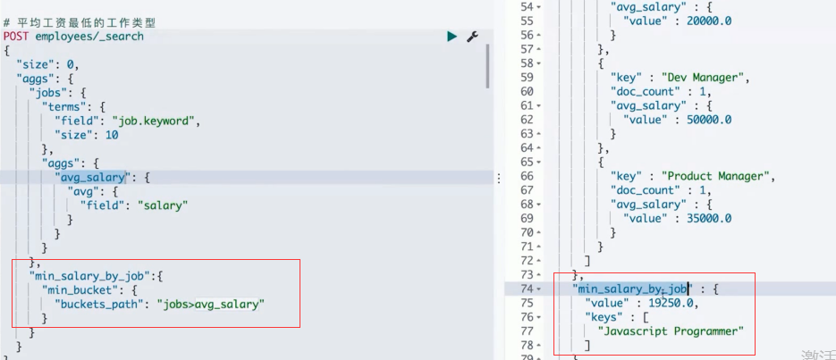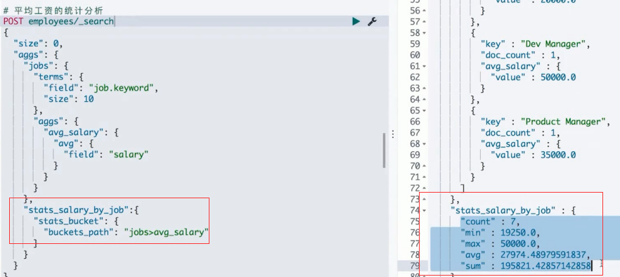 - diff是一个 bucket_script管道聚集,它的作用是向最终聚集结果中添加 代表最大值与最小值之差的diff字段。它通过buckets_path定义了两个参数max_price和min_price,并在script参数中通过脚本计算了这两个值的差作为最终结果,而这个结果将出现在整个聚集结果中